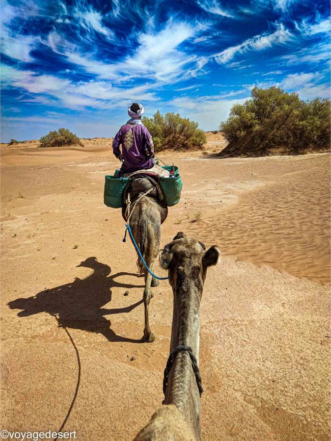Départ matinal à dos de dromadaire. Traversée des paysages désertiques jusqu’au lac Laawaina Lkehaila. Déjeuner près de Chantouf et continuation vers les grandes dunes du grand Abaidlia. Nuit en bivouac désert Maroc, moment fort de l’aventure Sahara Maroc.